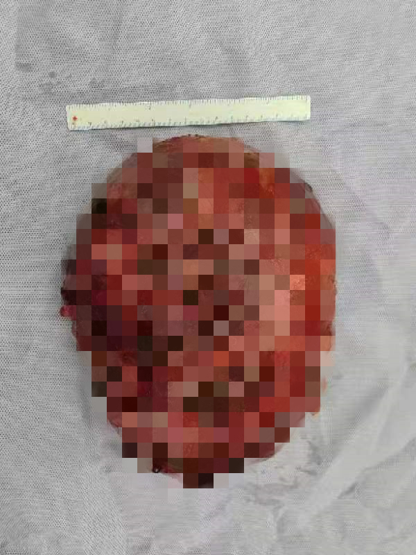 手术如期进行。当患者胸骨打开后,周清华教授团队发现巨大纵隔包块占据了几乎整个胸腔,其不但推移压迫了患者孱弱的心脏,而且还和周围组织、血管紧密地粘连在了一起。周清华教授团队凭借着精湛的手术技巧,与麻醉、护理团队密切配合,历经5个小时,成功为患者摘除这个“23cm×18cm×15cm”的巨大纵隔肿瘤,术后称重其重量高达8.7kg。术后通过一周的快速康复治疗、医护团队精心照护以及患者自身的恢复锻炼,患者顺利出院。