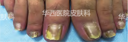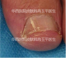 比如说下面这张图片,大家是不是觉得就是灰指甲啊?但实际上经过检查,趾甲内并没有真菌,最终确诊为甲银屑病。