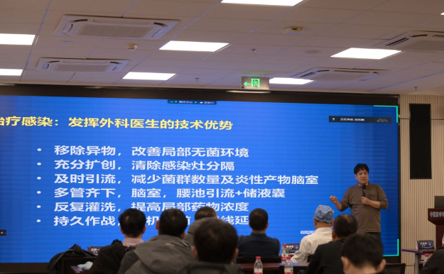 天坛医院创伤神经外科高国一教授做《颅内感染处置》学术讲课:从预防感染上重点就是管理脑室引流,通过颅骨“单独”钻孔引流,明胶海绵填塞,加强感染管控,常规筛查检验,控制引流时间。尤其是“常规脑脊液筛查”检验是必须的,需通过规范的操作,保证脑脊液检测结果和对应诊疗的及时性,而不是延长筛查的时间。从治疗感染上高教授认为,脑脊液感染是颅腔内的脓毒症,各类屏障的存在,极大降低了局部给药的全身并发症,所以更推荐局部给药。治疗感染需发挥外科医生的技术优势:1、移除异物,改善局部无菌环境。2、充分扩创,清除感染灶分隔。3、及时引流,减少菌群数量及炎性产物脑室。4、多管齐下,脑室,腰池引流+储液囊。5、反复灌洗,提高局部药物浓度。6、持久作战,时机提前战线延长。
